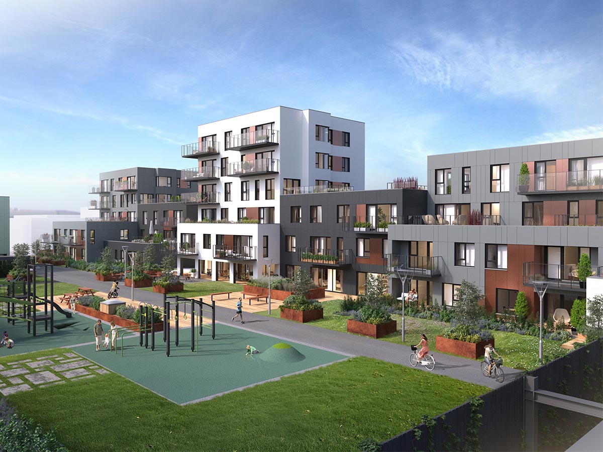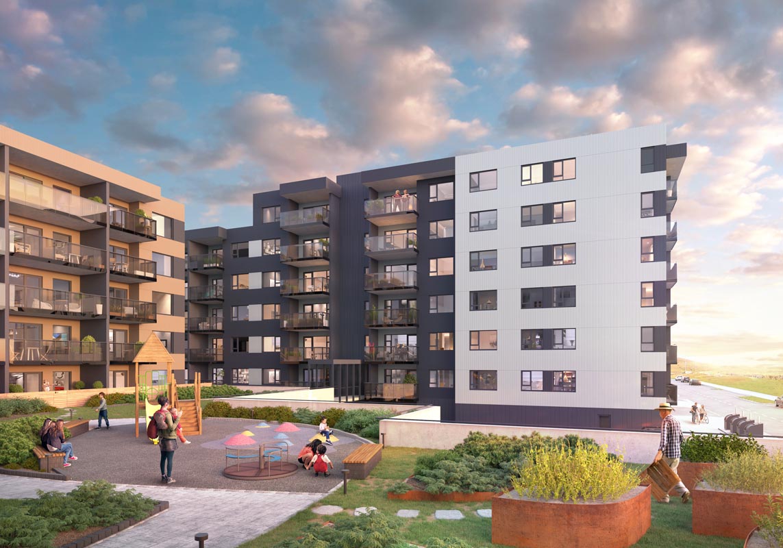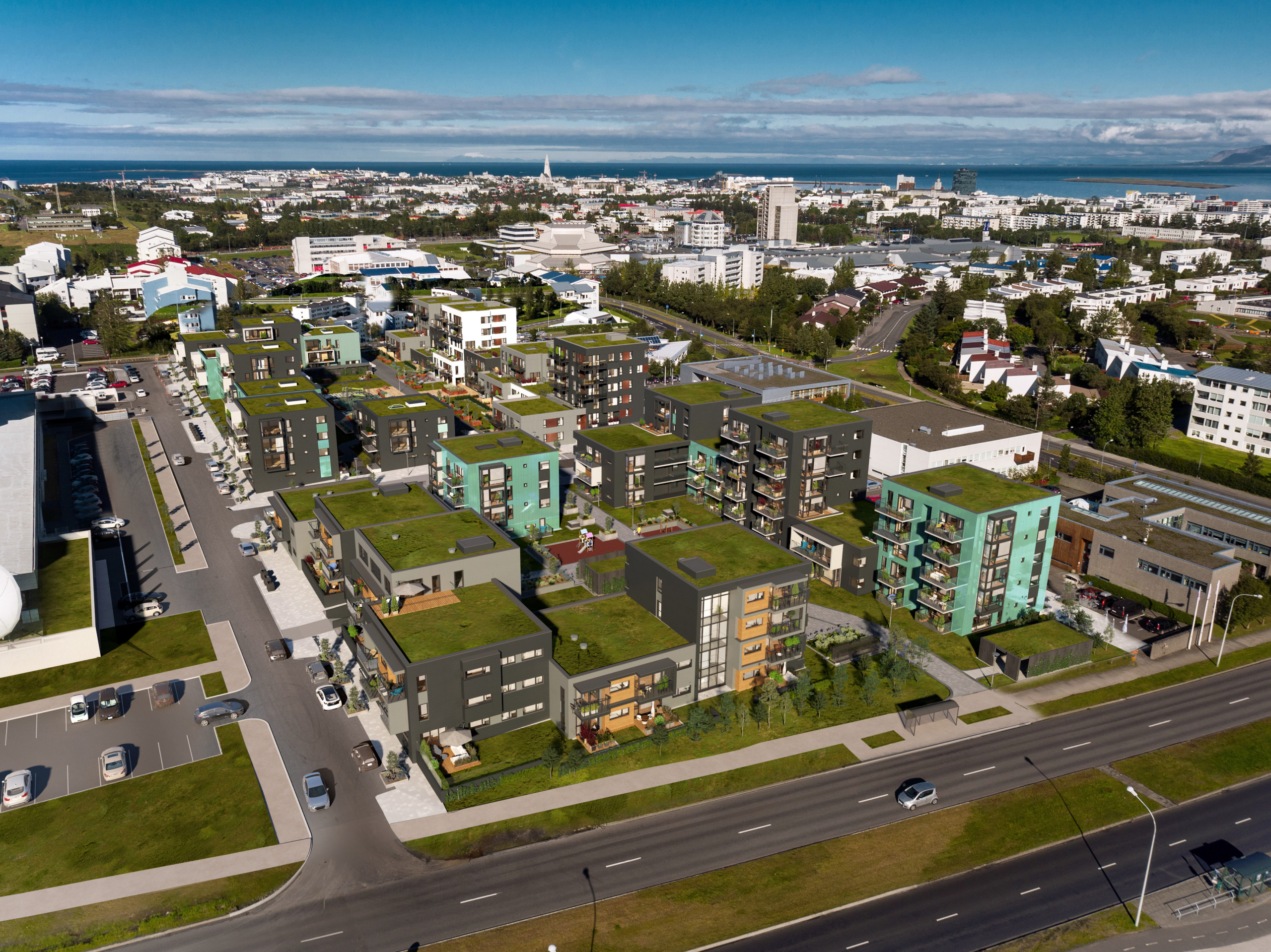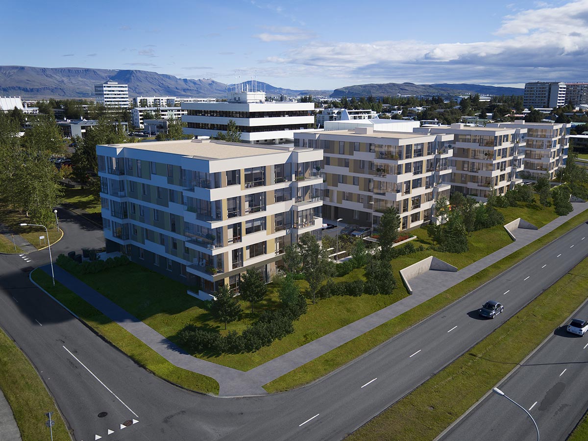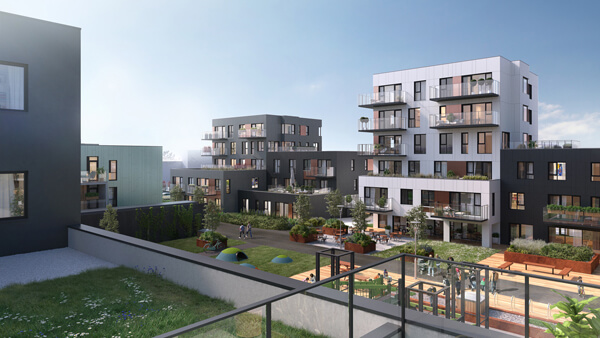 Vandaðar byggingar voru reistar í kringum skjólgóðan og sólríkan inngarð sem myndar skemmtilega umgjörð fyrir samfélagið í kjarnanum.